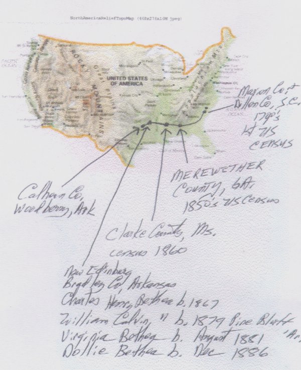 Map of Tristram's branch movement west starting in Marion Coutry, SC. By the time of the US Census of 1850, they were living in Meriwether County, GA. Tristram's son Tristram Pinkney7 continued west to Arkansas. Click here to read General Winfield Scott's Address to the Cherokee Nation ( May 10, 1838) |