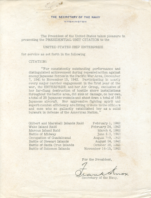Left on the Carrier Enterprise, survived Battle of Midway and others. Recipient of the Presidential Citation Award.